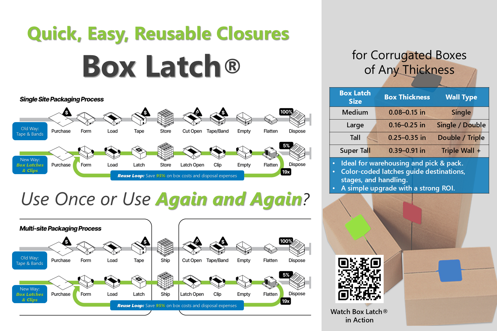 The Box Latch® makes it quick and easy to open and close corrugated boxes—again and again. Unlike tape, staples, or strapping, this reusable fastener reduces waste, lowers material costs, and supports sustainable packaging practices.